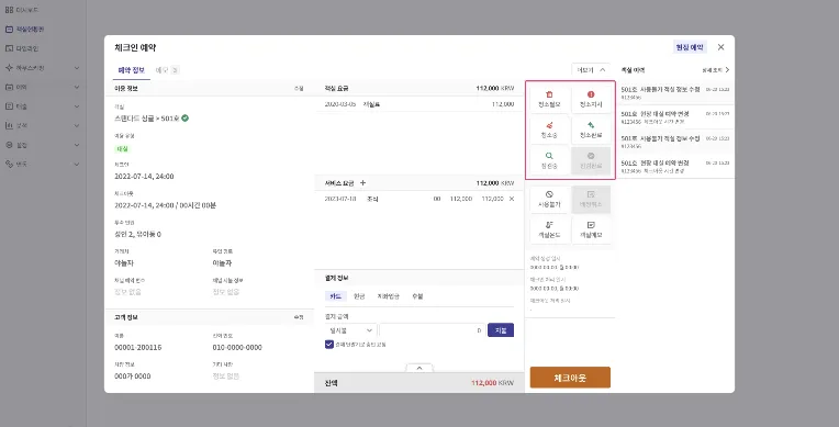 각 객실을 클릭하여 체크인 처리, 워크인 등록, 체크아웃 처리가 가능합니다.