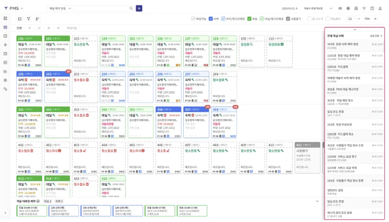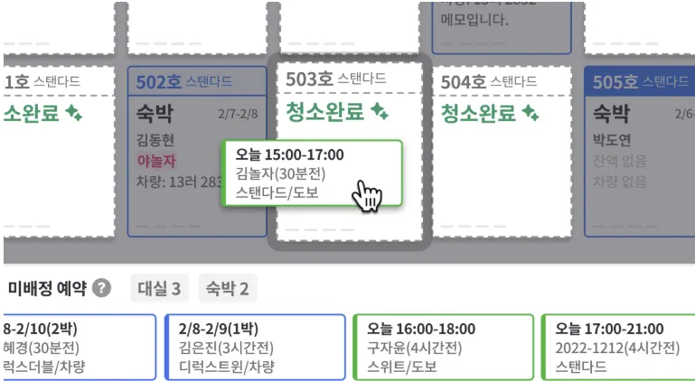 객실 블럭의 색상과 표시되는 아이콘, 일정을 통해 객실의 사용 현황을 파악할 수 있습니다.