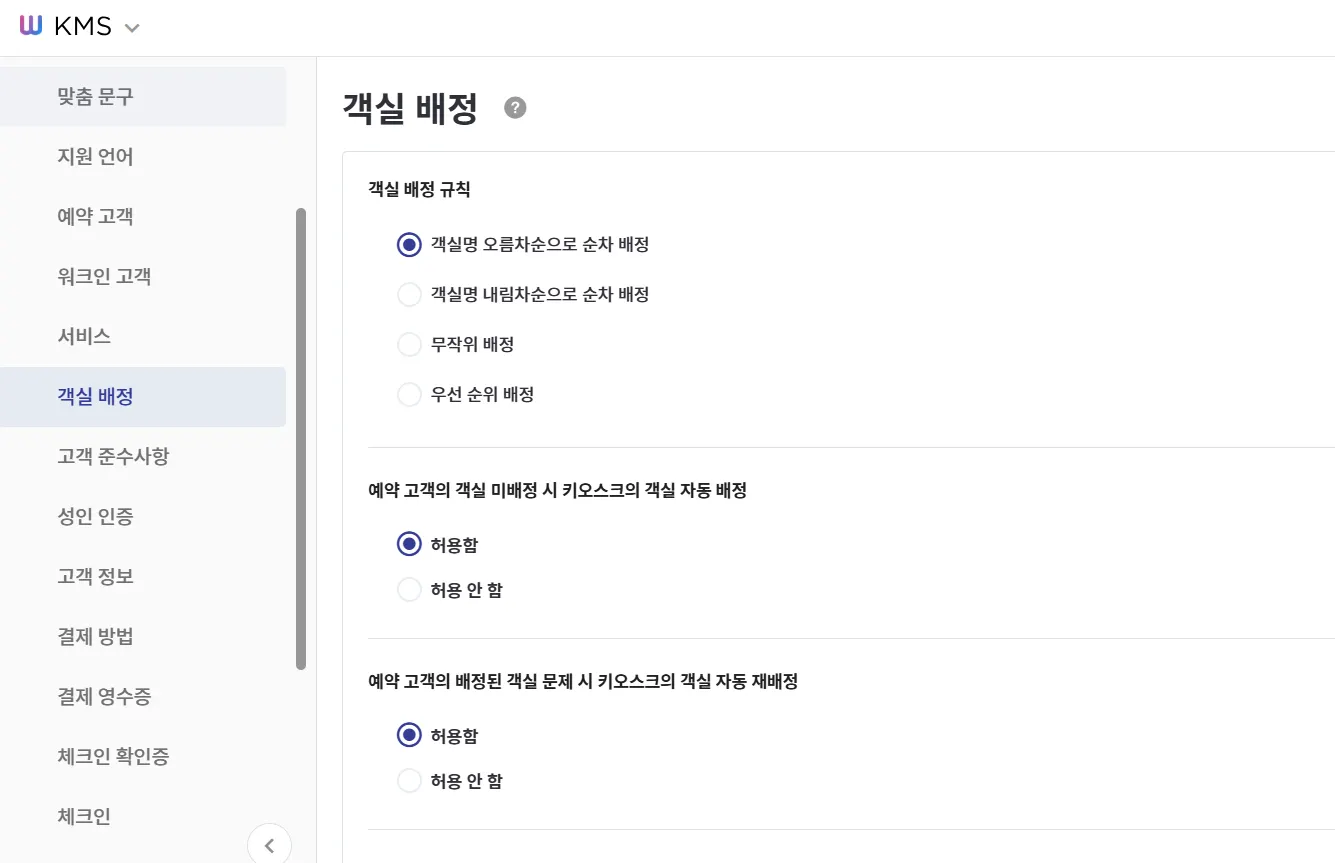 예약 고객의 객실 미배정시 키오스크의 객실 자동 배정 허용 여부를 설정할 수 있습니다.