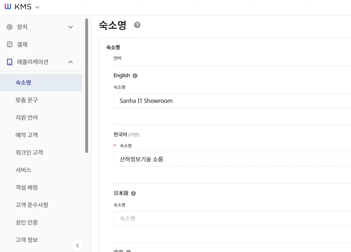 키오스크에서 사용될 숙소명을 언어별로 설정하고 [저장] 버튼을 클릭하면 적용됩니다.