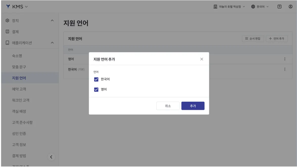 키오스크에 사용될 지원 언어의 순서 편집과 언어 추가를 할 수 있습니다.
