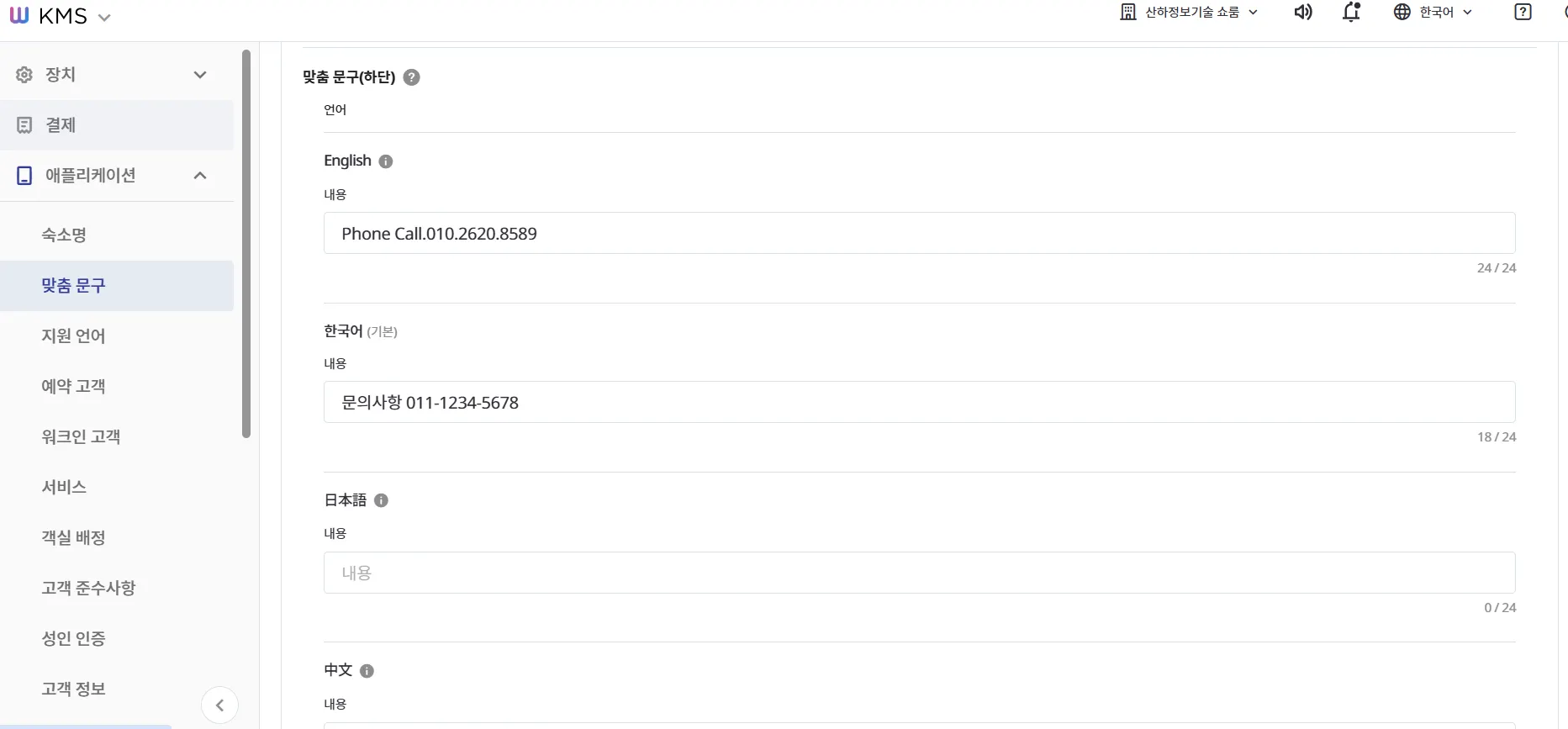 키오스크의 상단과 하단 / 그리고 숙소명 하단에 표시될 문구를 언어별로 설정하고 [저장] 버튼을 누르면 적용됩니다.