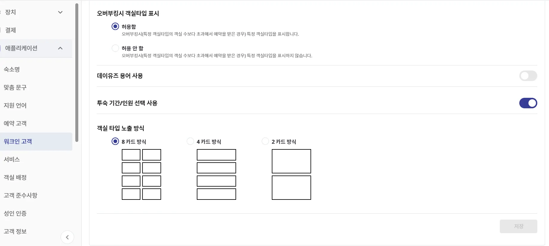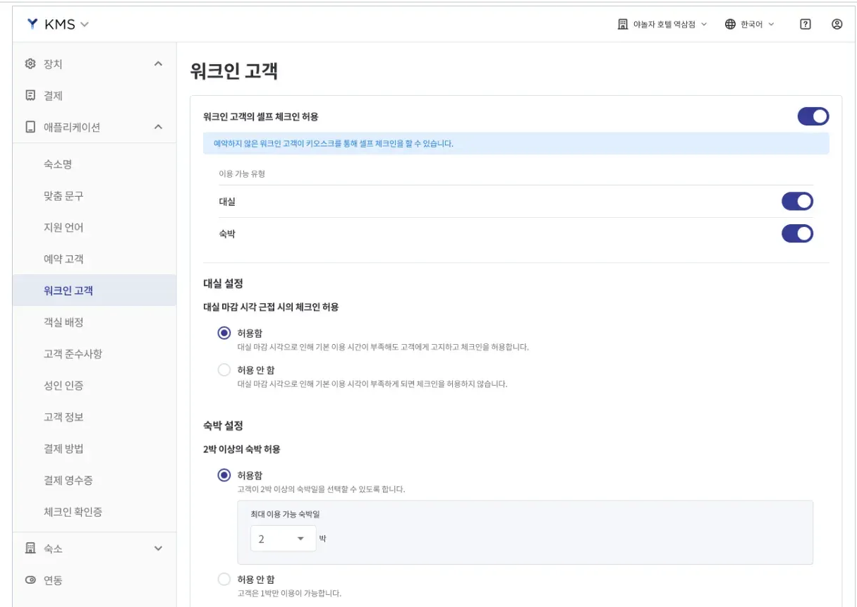 워크인 고객의 셀프 체크인을 허용할 지 여부를 설정할 수 있습니다.