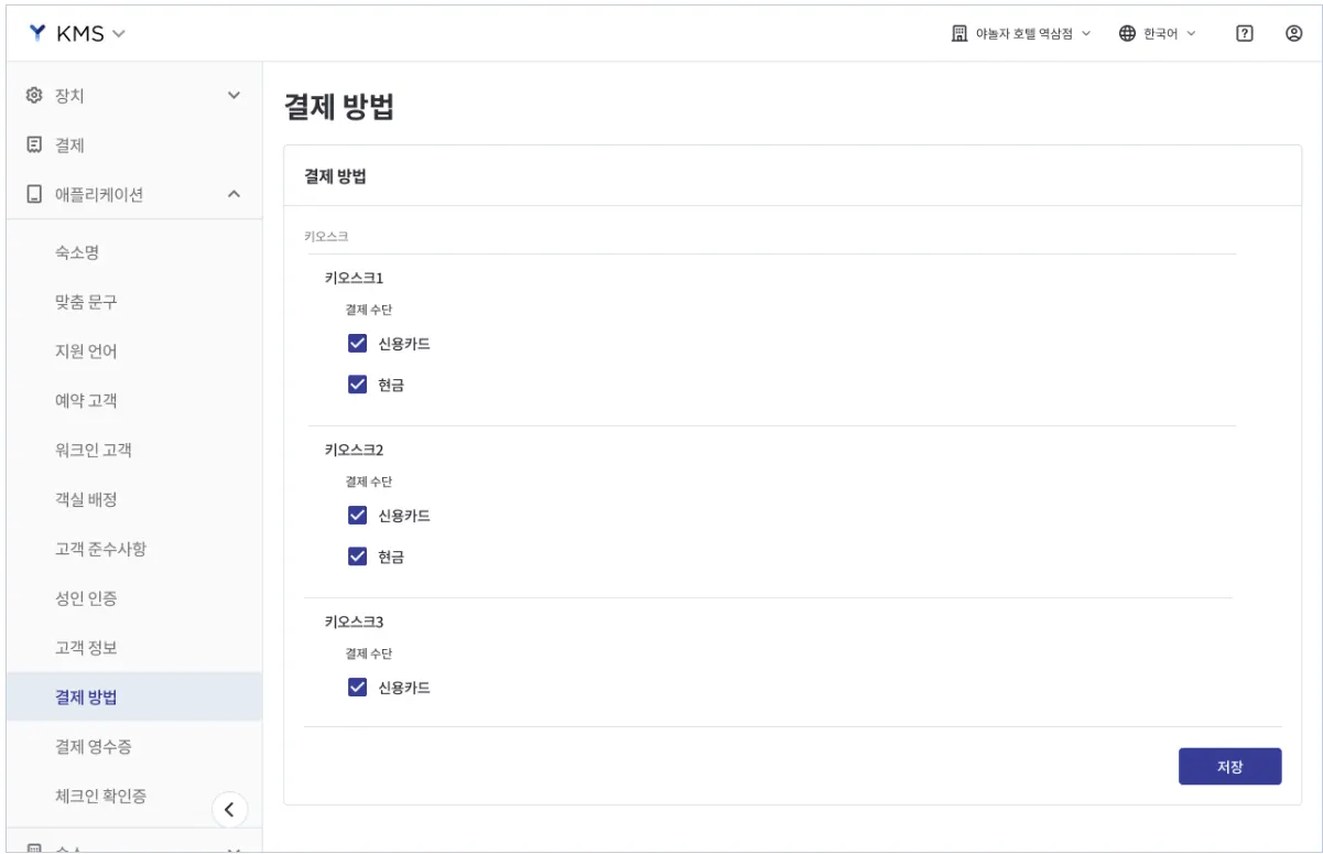 키오스크별로 결제 방법을 설정할 수 있습니다.