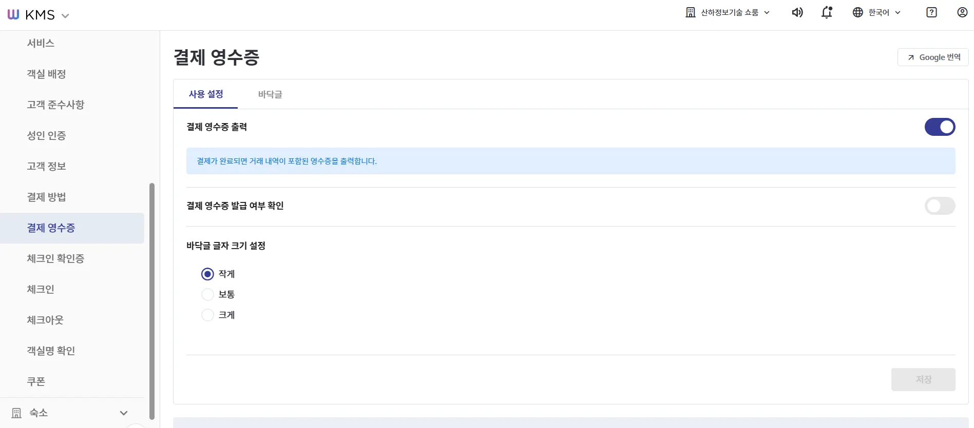 키오스크에서 발급되는 결제 영수증의 출력 여부와 바닥글을 설정할 수 있습니다.