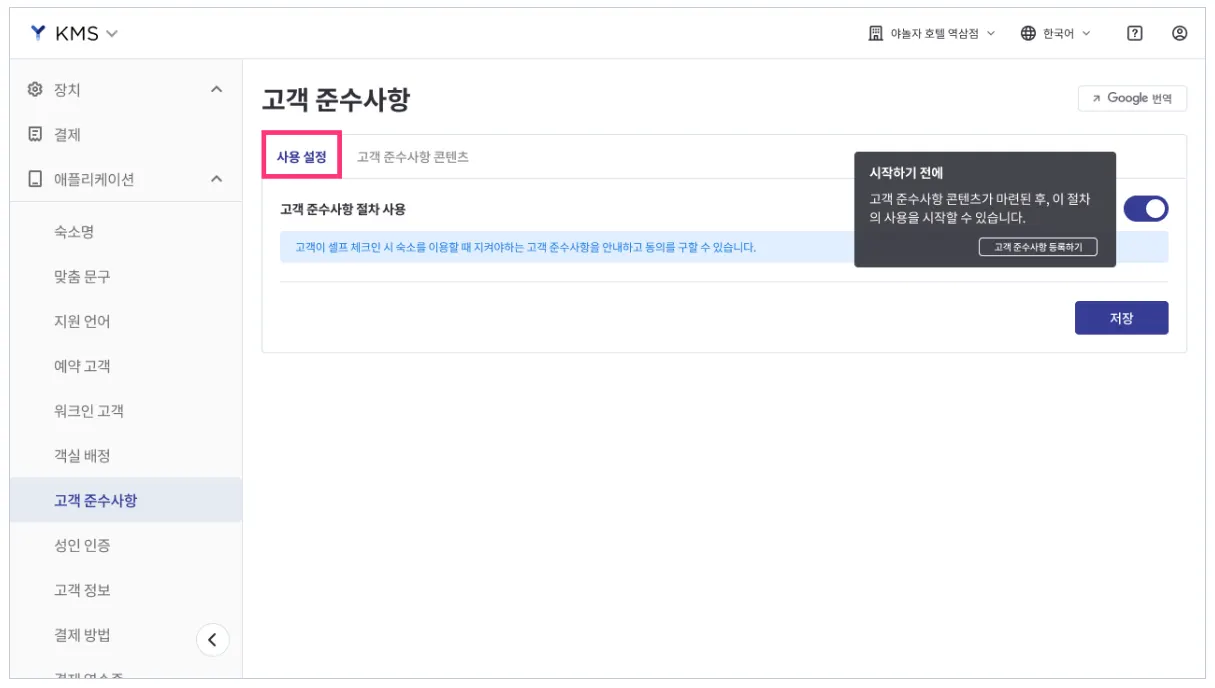 사용설정에서 고객 준수사항 절차 사용 여부를 설정할 수 있습니다.
