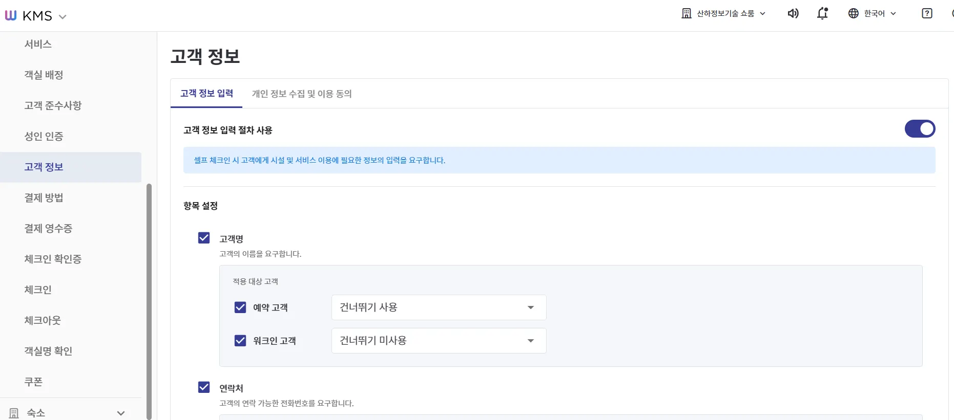 고객 정보 입력 절차 사용 여부 및 항목을 설정할 수 있습니다.