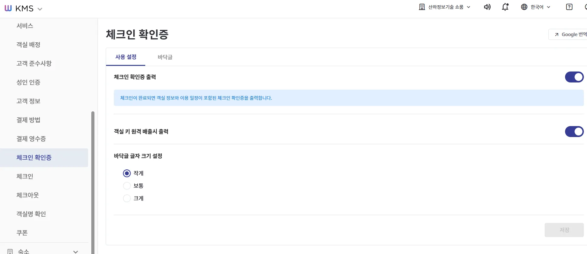 키오스크에서 발급되는 체크인 확인증의 출력 여부와 바닥글을 설정할 수 있습니다.