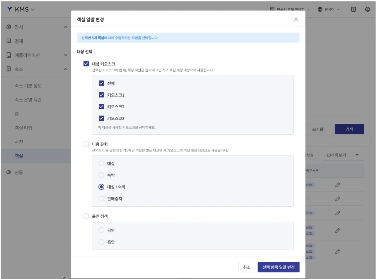 대상 키오스크, 이용 유형, 흡연 정책을 일괄 변경할 수 있습니다.