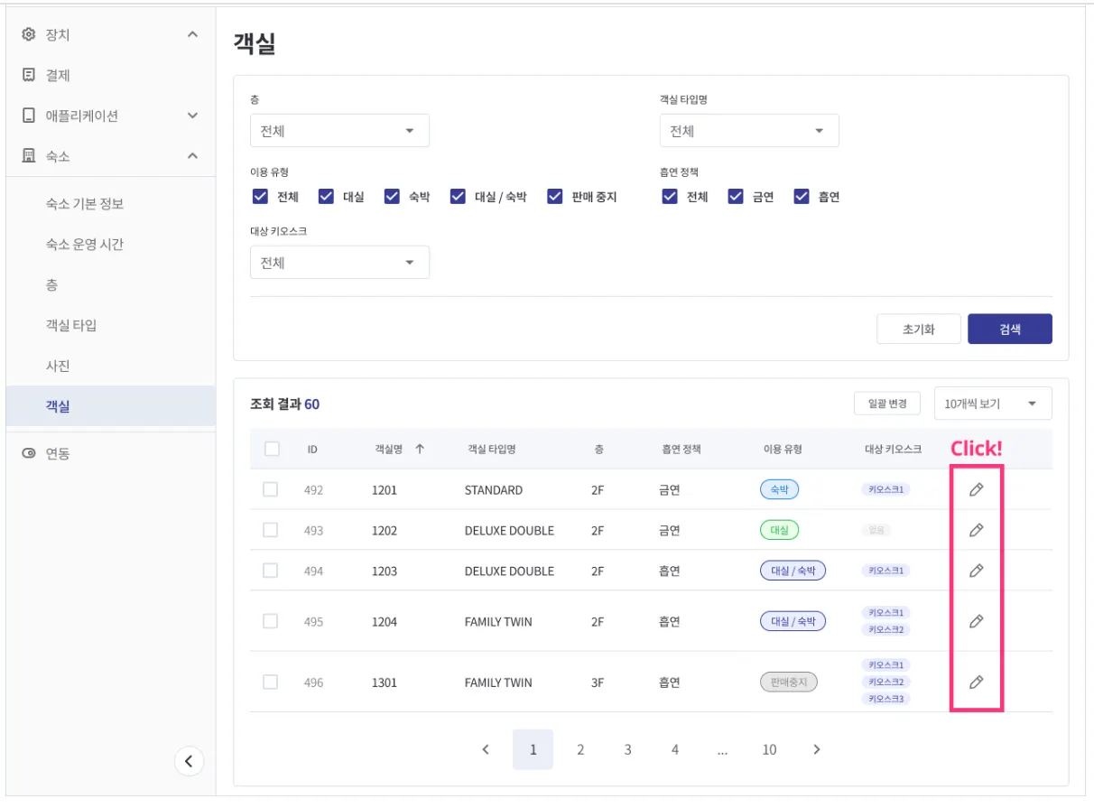 층, 객실 타입명, 이용 유형, 대상 키오스크에 따라 연동된 객실정보를 검색하실 수 있습니다.