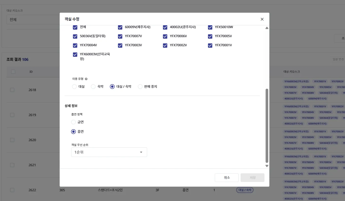연필 아이콘을 선택하면 객실 수정 팝업이 표시됩니다. 정보를 설정한 후 [저장] 버튼을 클릭하면 반영됩니다.