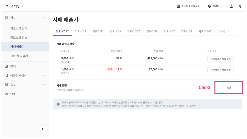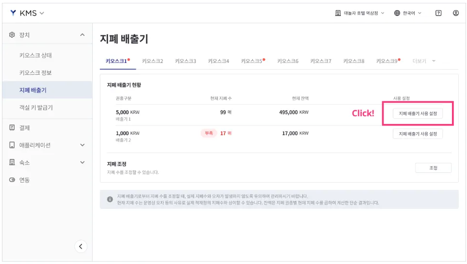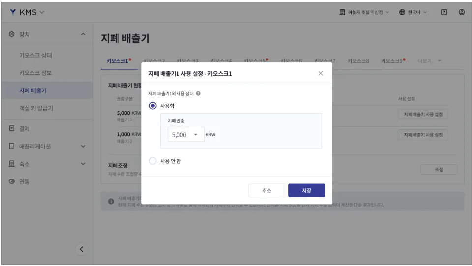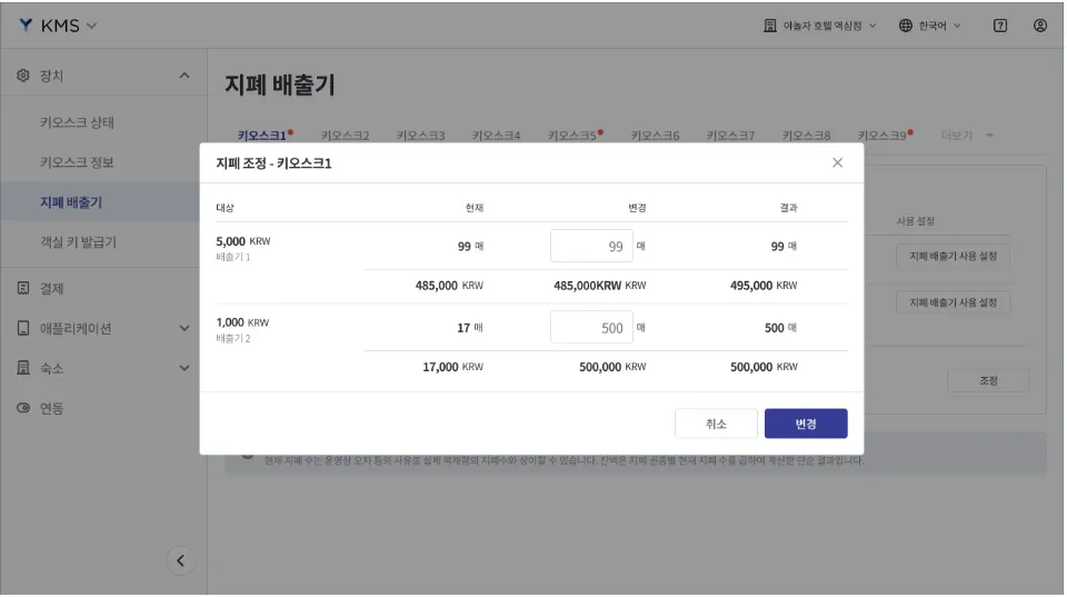 키오스크의 지폐 배출기 상태 확인, 권종 설정 및 지폐 수량 조정이 가능합니다.
