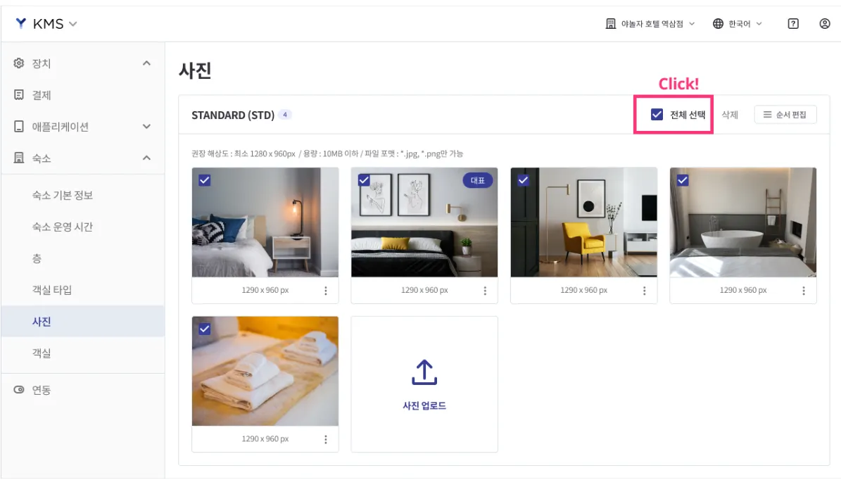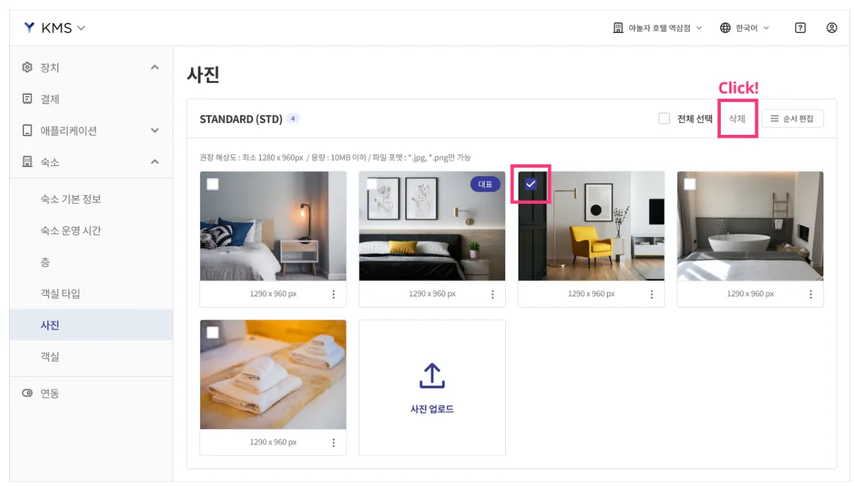 전체 선택 버튼을 클릭한 뒤 [삭제] 버튼을 클릭하면 등록된 객실 사진 전체가 삭제됩니다.