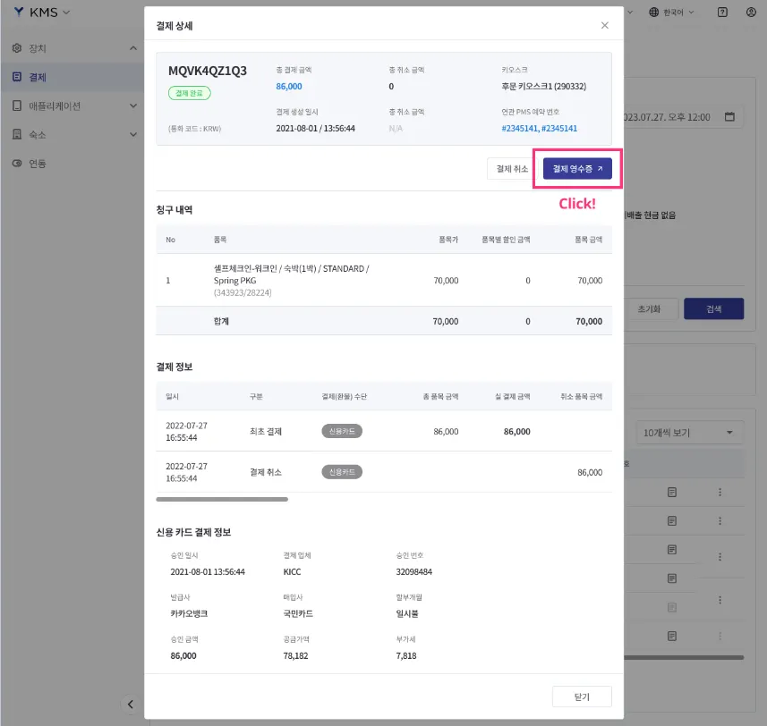 [결제 영수증] 버튼 클릭 시 결제 영수증 팝업이 표시됩니다.