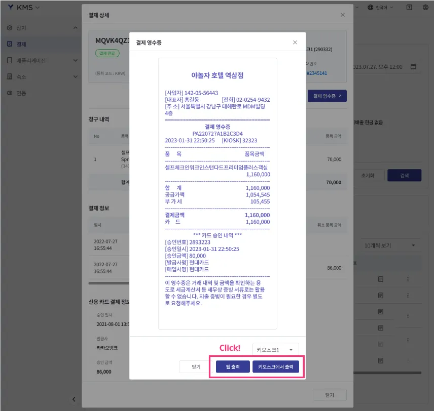 팝업에서 출력 방법을 선택하여 결제 영수증을 재발행할 수 있습니다: