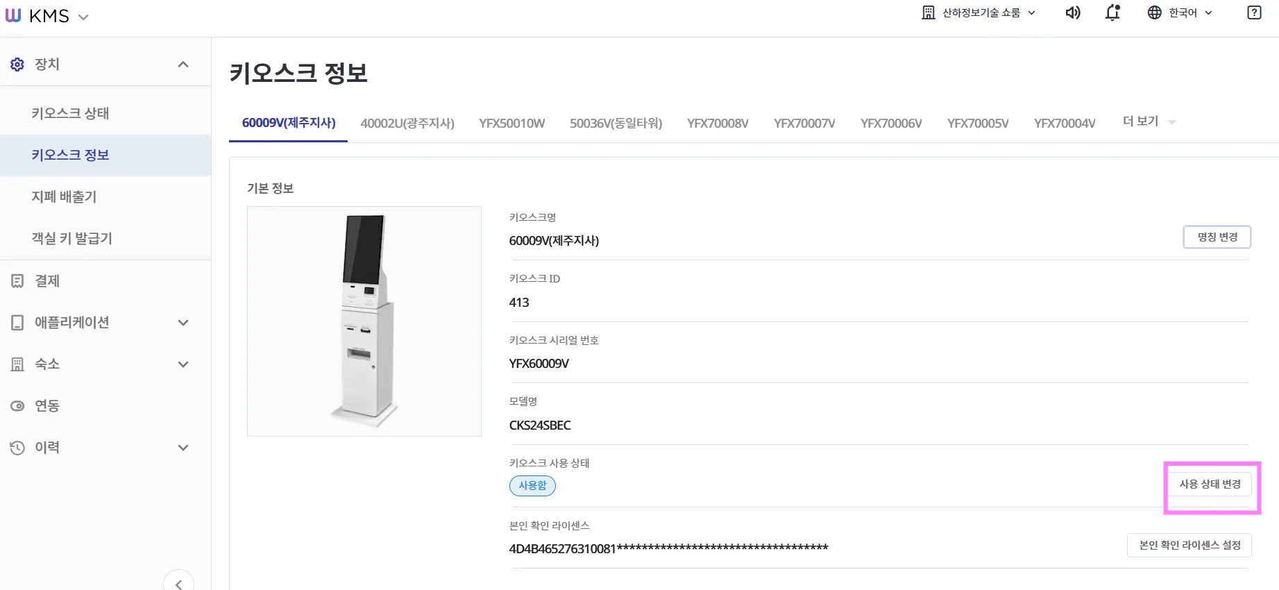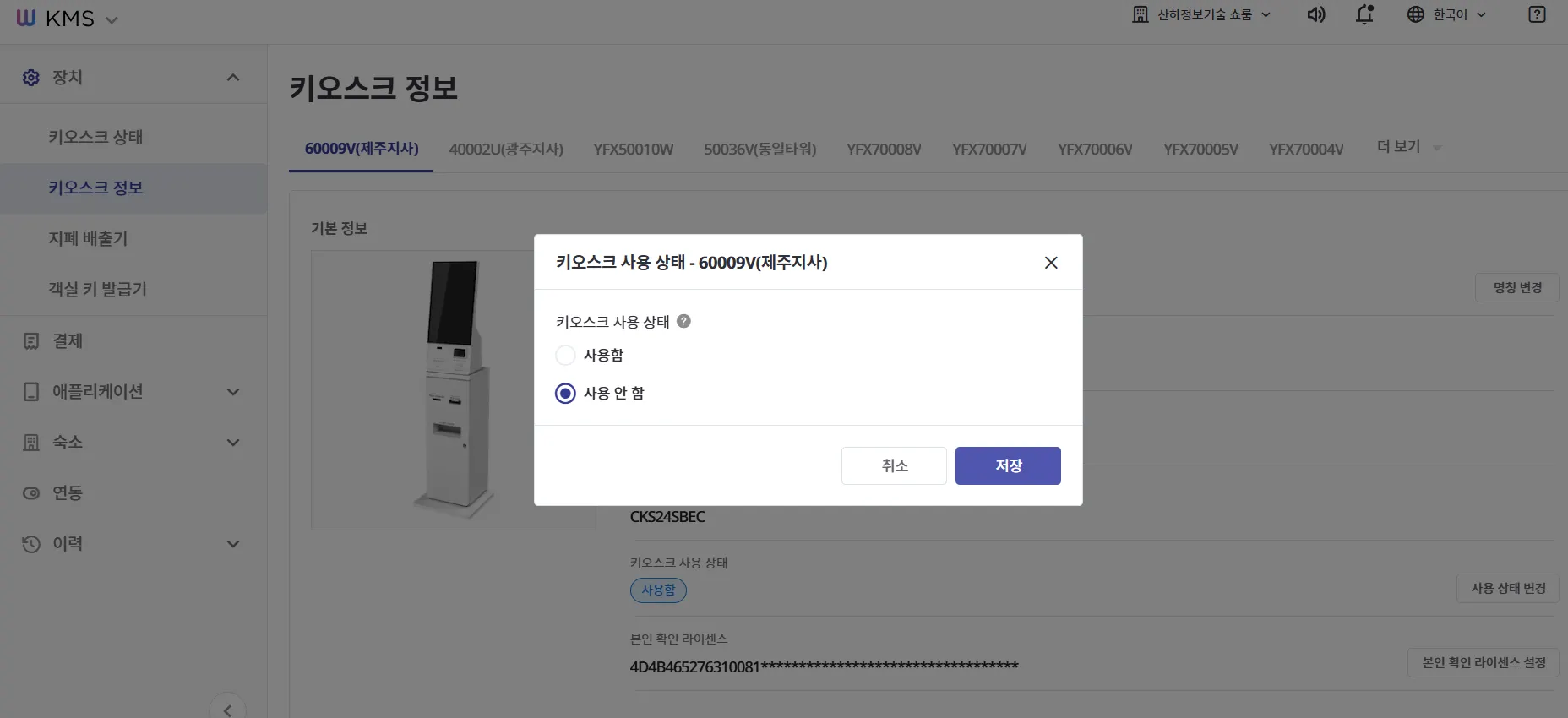 키오스크의 기본 정보 및 지원 장치 현황을 확인할 수 있습니다.