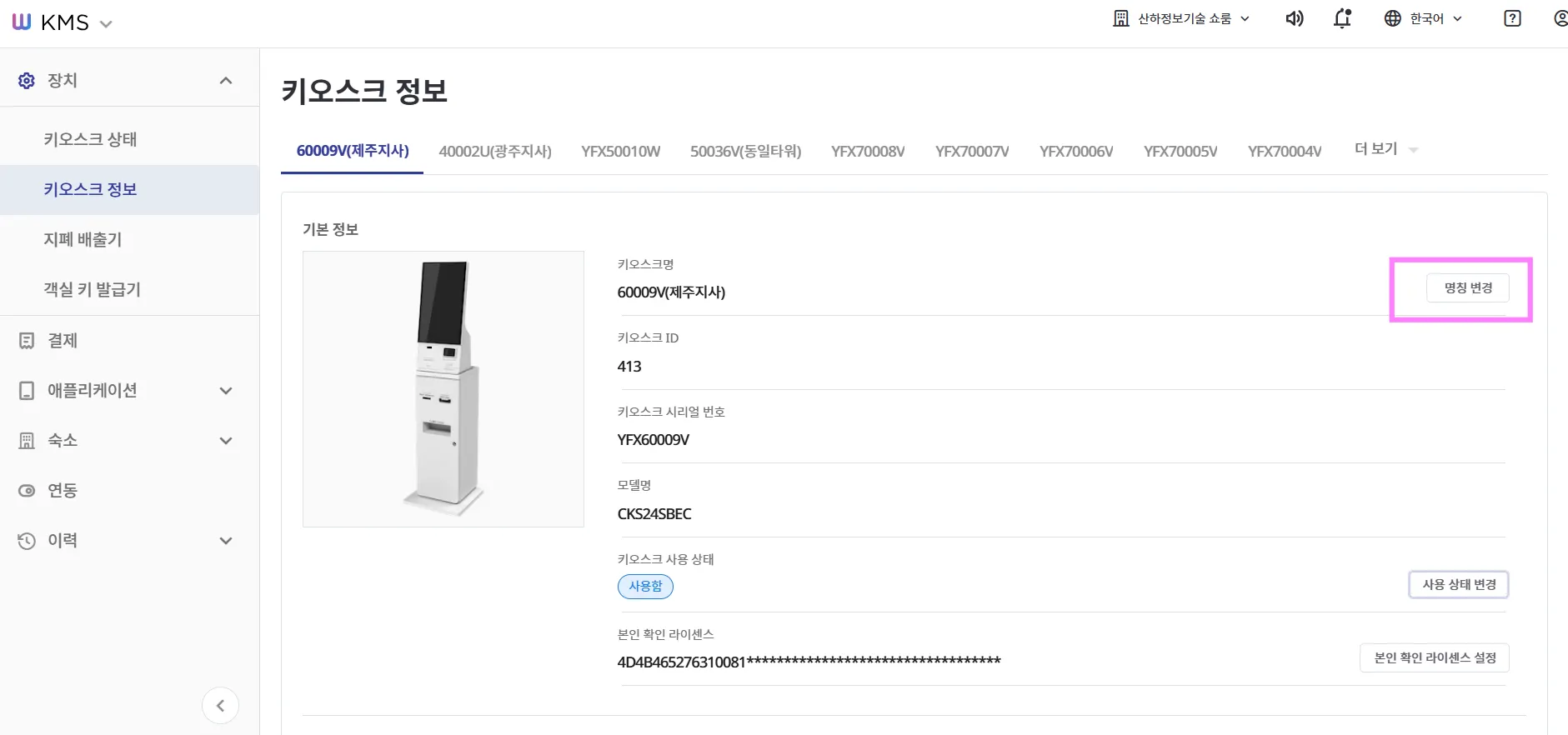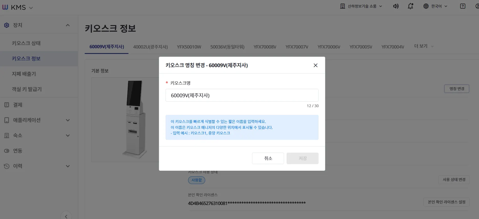 새 키오스크명을 입력하고 **[저장]**을 클릭하면 키오스크 명칭이 변경됩니다.