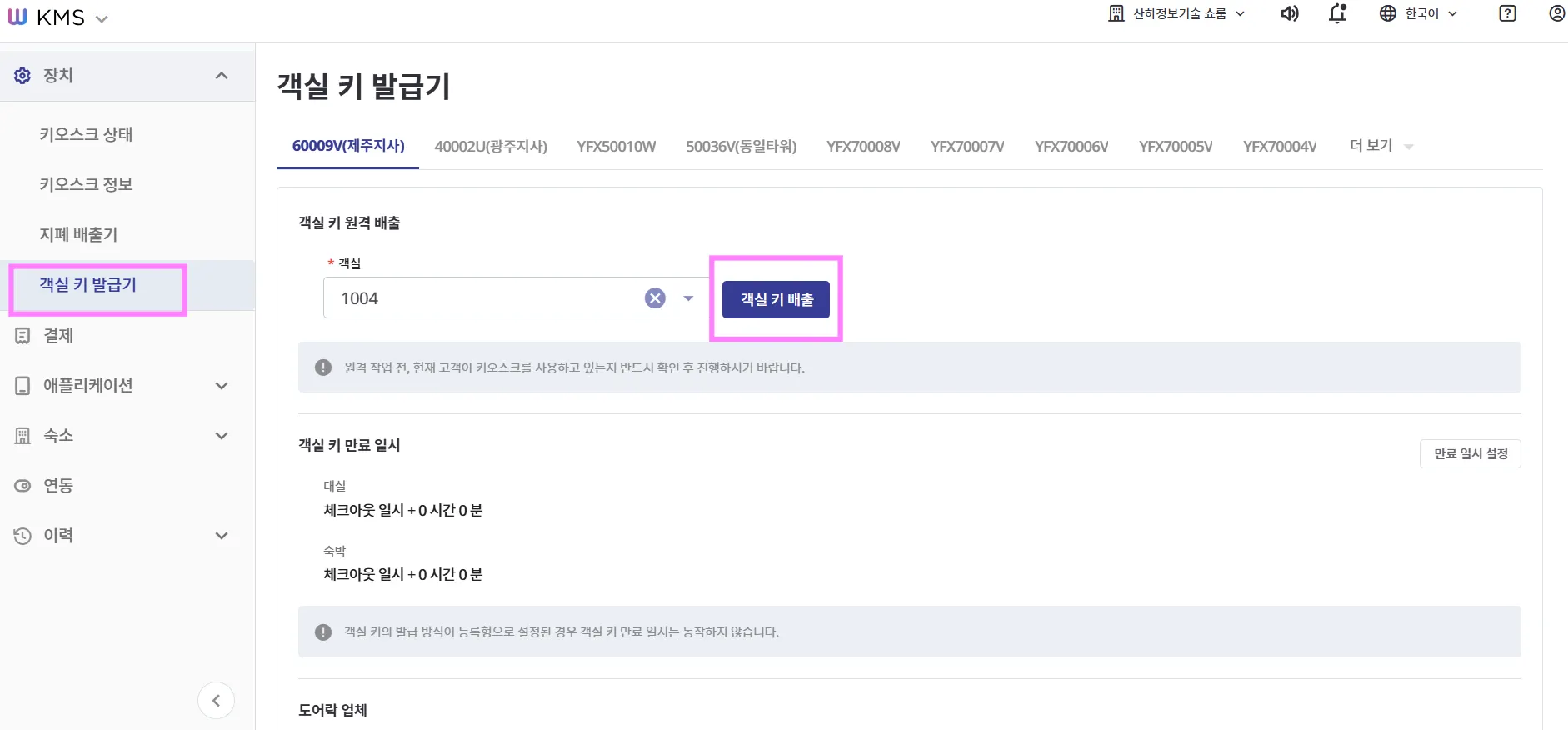 객실 키 정보, 발급 현황, 원격 배출 기능을 확인 및 제어할 수 있습니다.